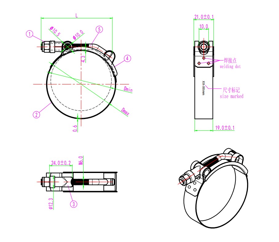 2.The band of stainless steel t-bolt clamps are 0.6mm thick,and 19mm width rounded edge,which won’t damage the hose or pipes.